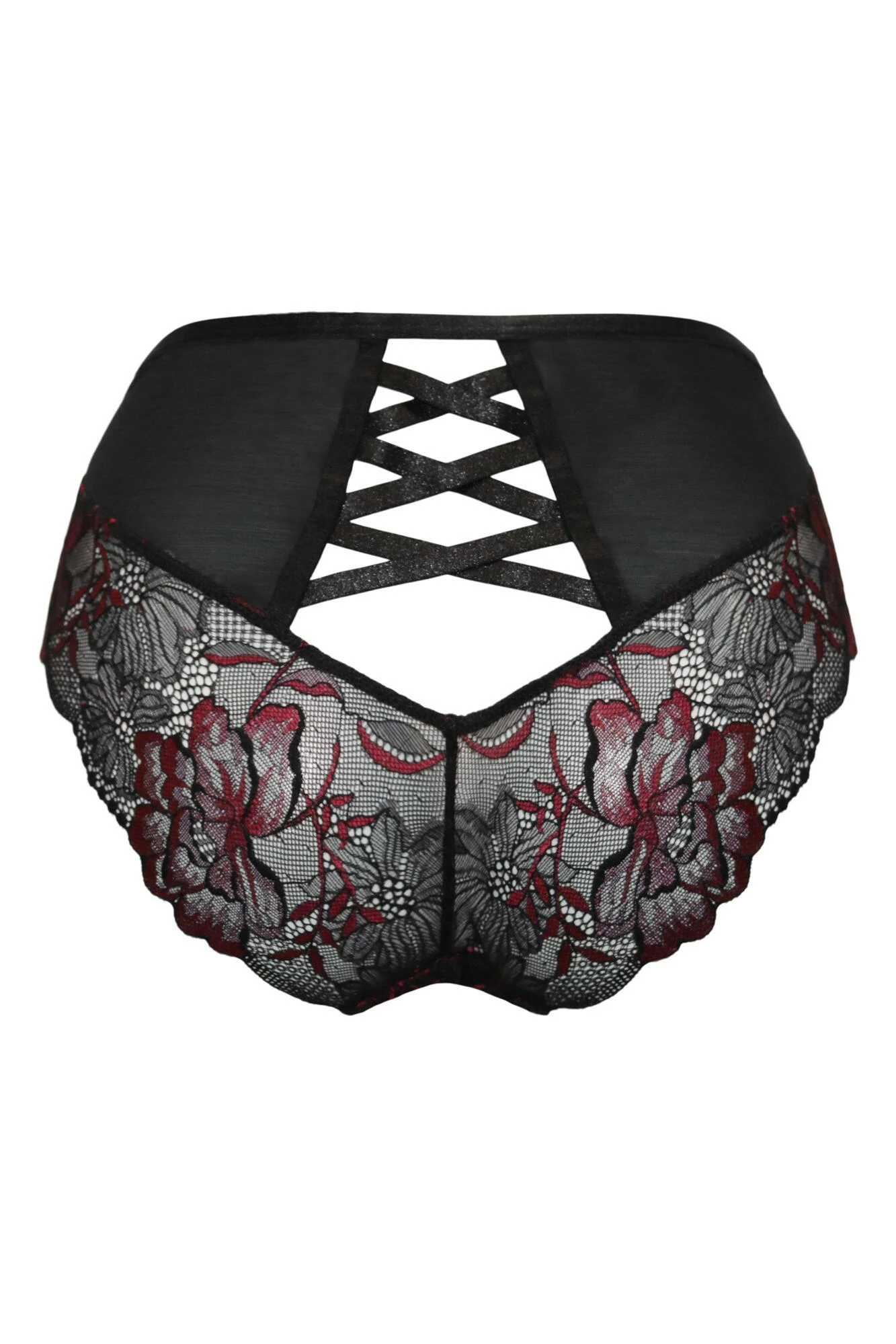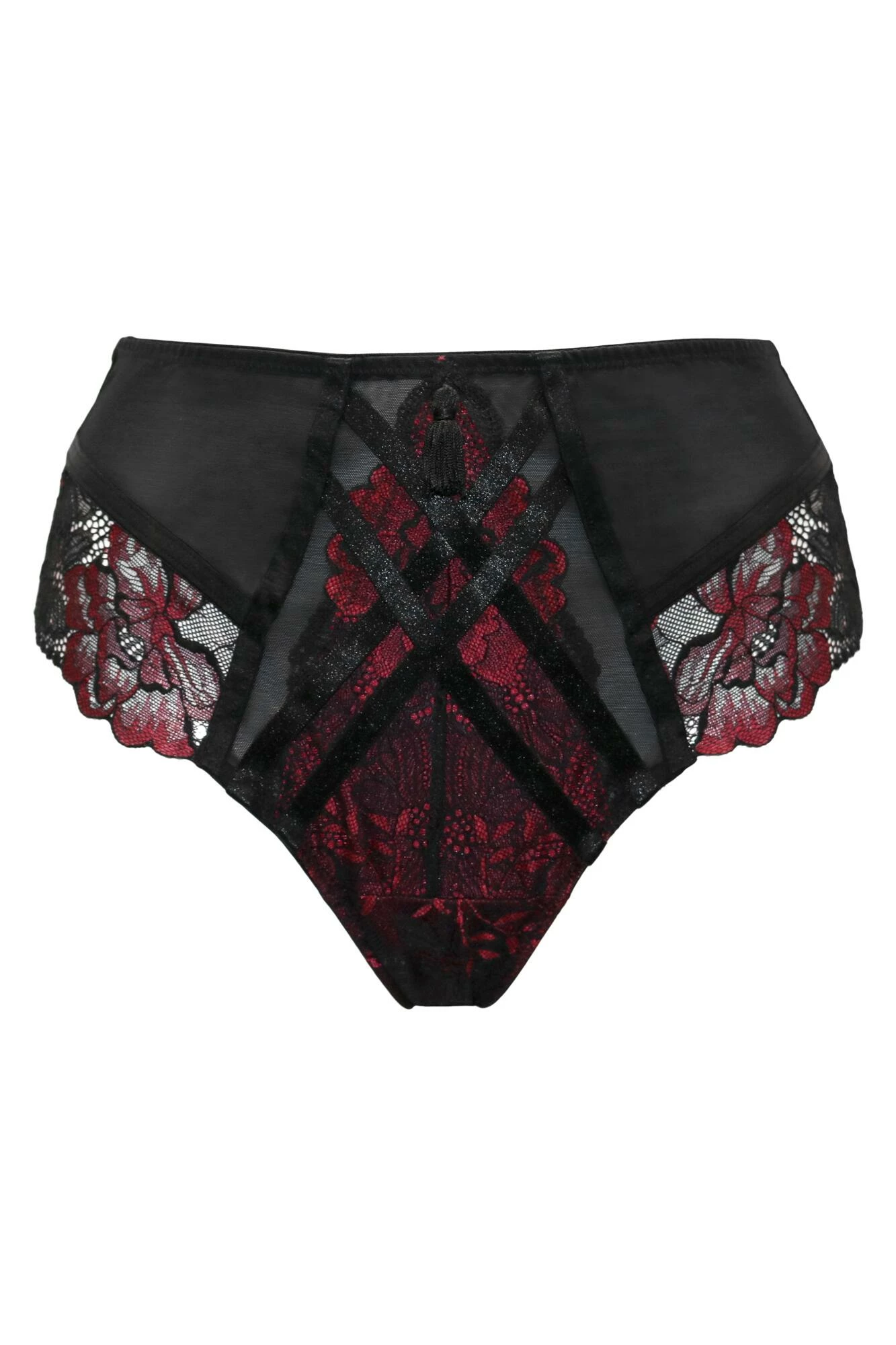Feel sexy in the After Hours High-Waist Brief. This seductive deep style brief offers full coverage but also includes a cheeky keyhole back with caged strapping detail. Decorated in opulent lace, sexy mesh, and scalloped edging for a sensual look. Finished off with a feminine delicate tassel detail at the front. Match with a bra and suspender from the After Hours collection for a seductive set.Â