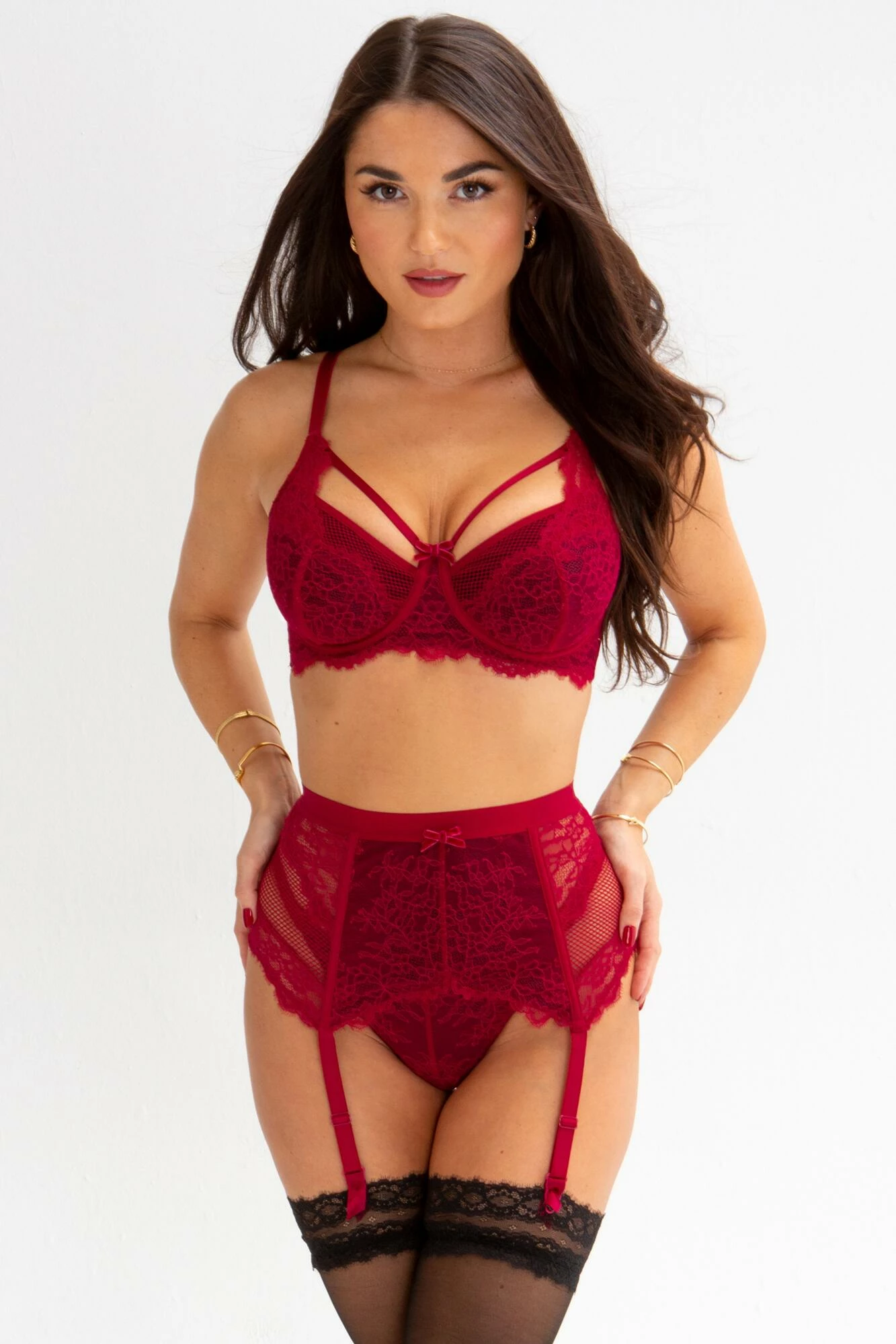 Elevate your lingerie collection with these deep suspenders from the Dark Romance collection. Featuring eyelash lace and fishnet panel detailing to tap into your romantic side. Feel sexy and supported with adjustable suspender ends and hook and eye fastening. For a look that will have hearts racing, match with lingerie from the Dark Romance collection.