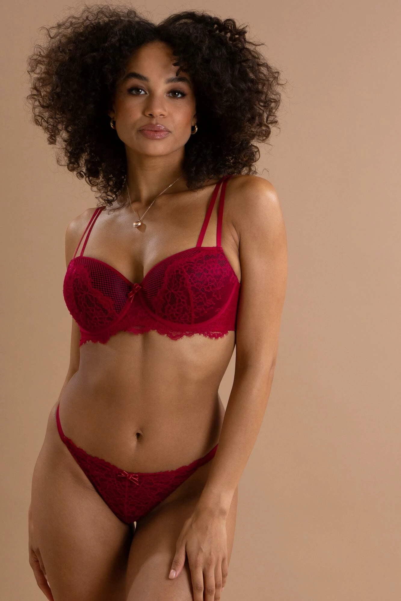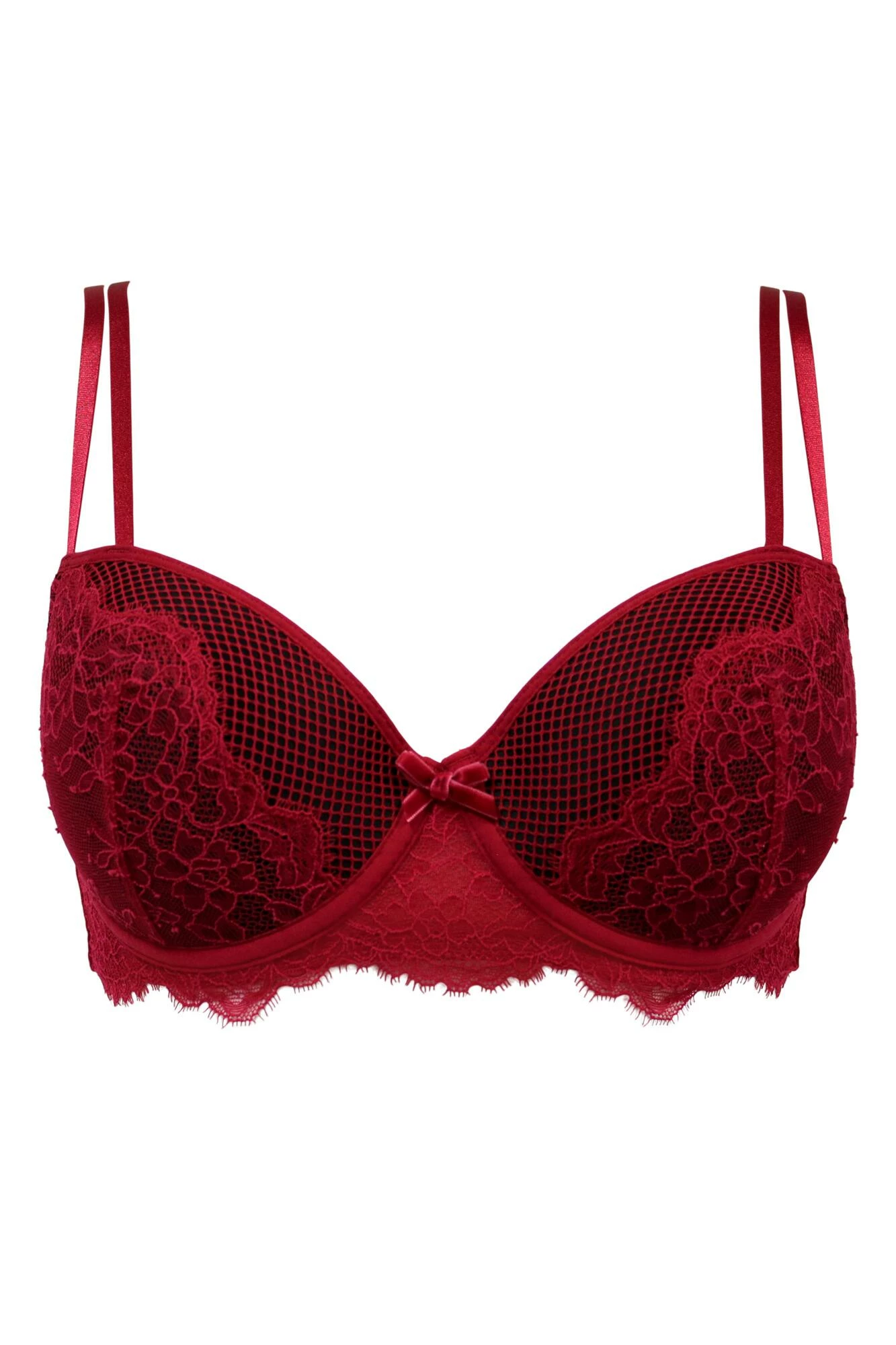 Feel irresistible in this seriously sexy padded underwired bra with caged strap detail. Made with a mix of fishnet and delicate scalloped eyelash lace for a daring and feminine look. Go for a sexy set and pair with matching underwear from the Dark Romance collection for the ultimate romantic look.Â