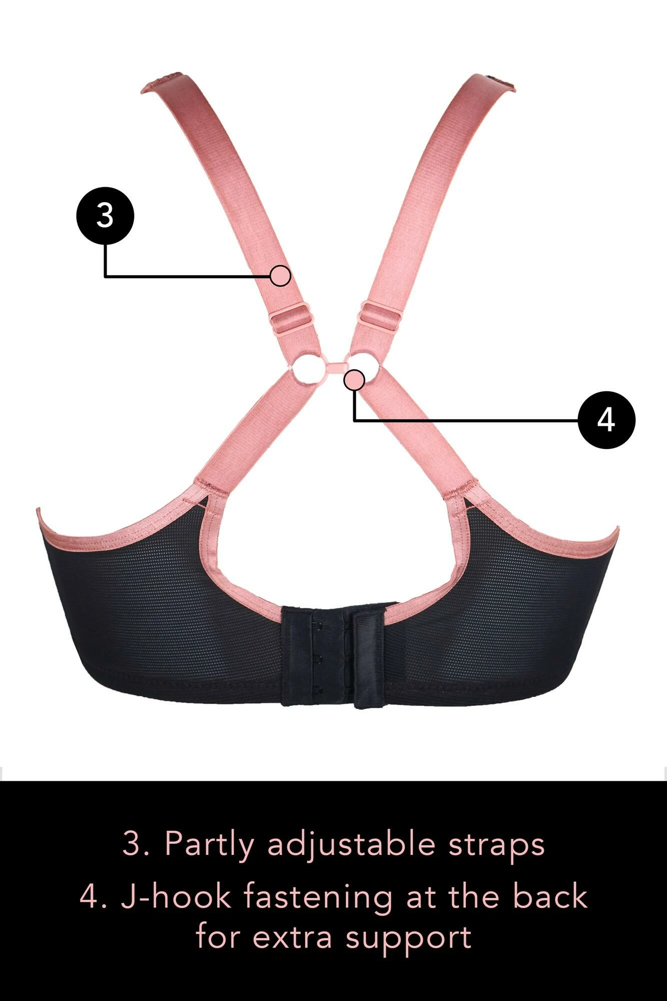- J-hook fastening at the back for extra support, allowing you to convert to a racer back