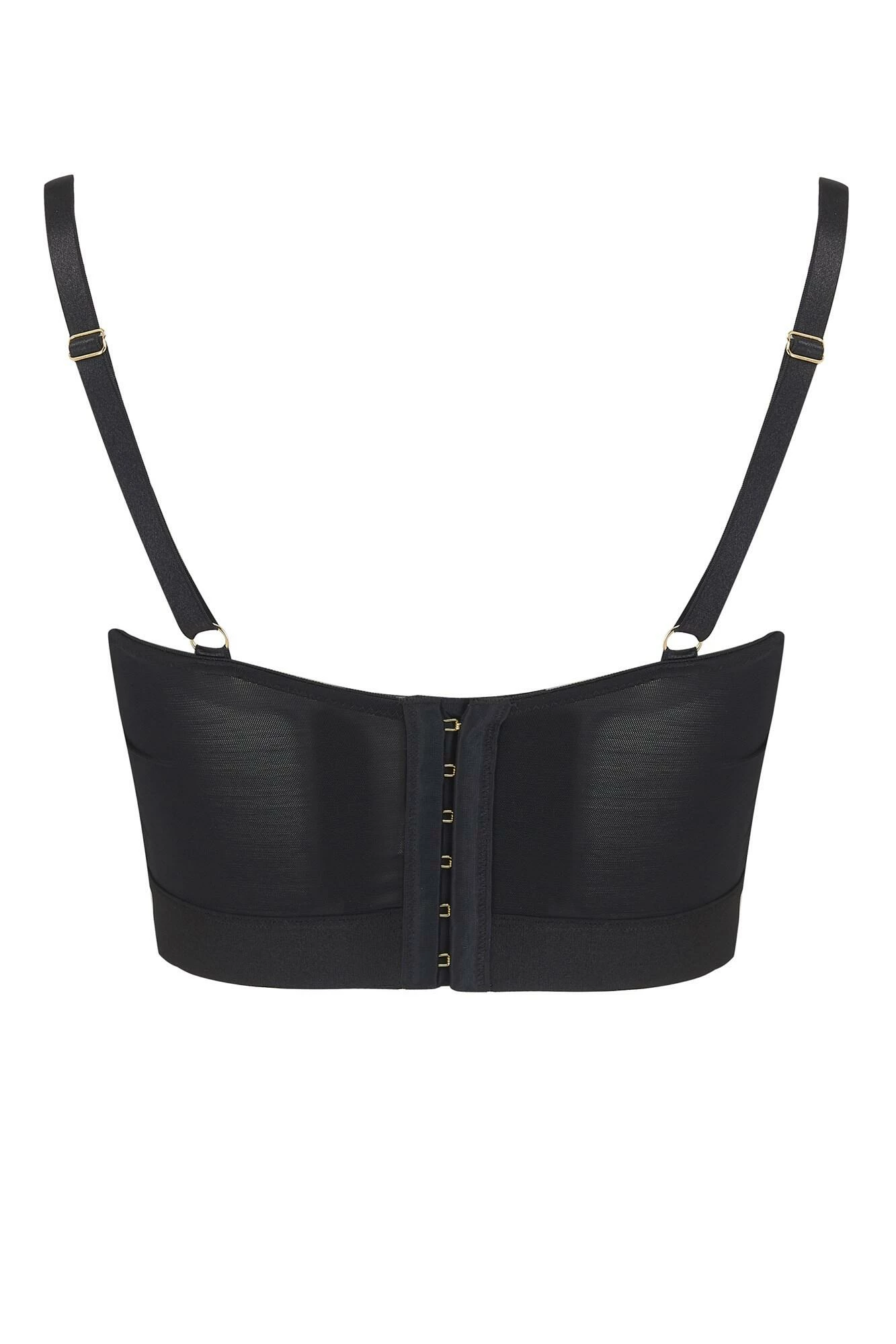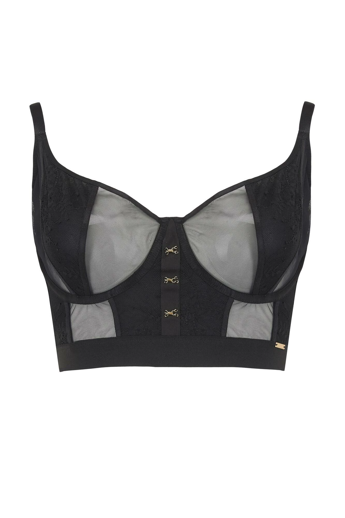 India loves worn-to-be-seen lingerie, so a gorgeous black bustier in mesh and lace was always going to feature in her collection.With underwire to give you shape and support, the non-padded bustier also has corset-style hook-and-eyes to the front. Designed in luxe gold they add that boudoir-fabulous finish. With its deep band, sexy mesh panels and longline shape it looks fabulous however you want to style it. Dress it up or down, or make like India and wear it with a satin skirt and a blazer.Â