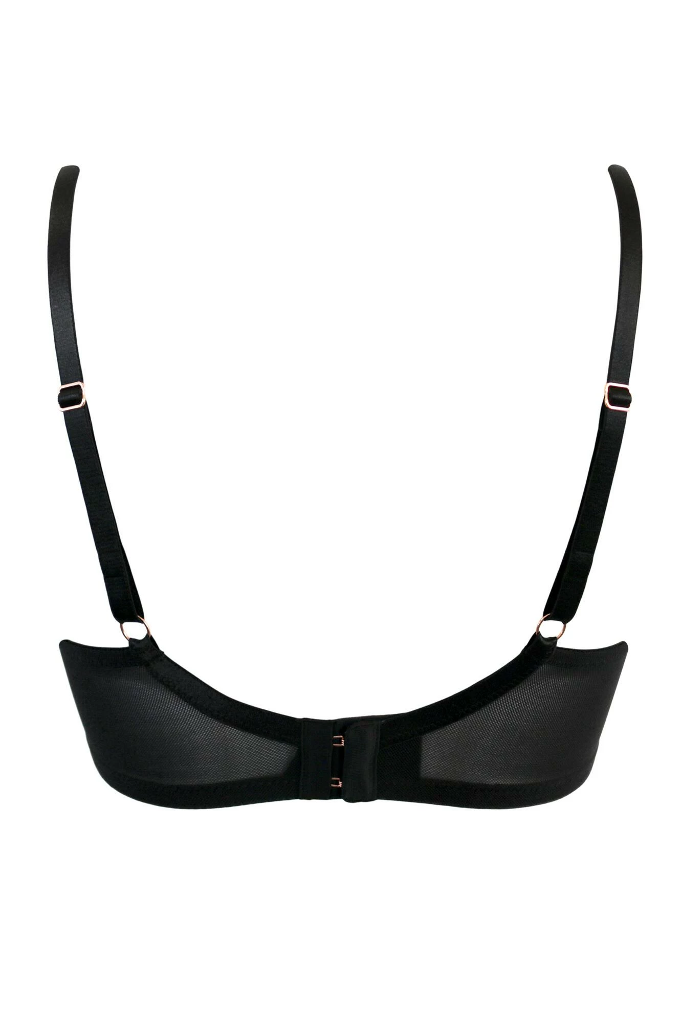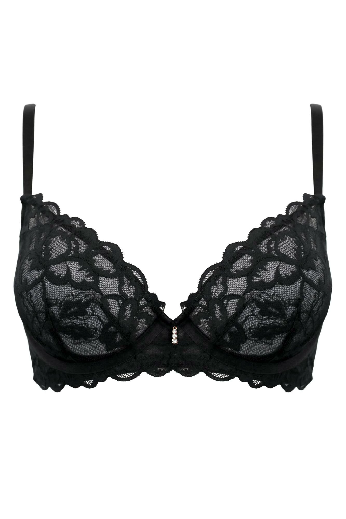 The non-padded, underwired Manhattan Plunge Bra highlights your natural shape and ensures all-day comfort. This must-have sexy style is covered in beautiful semi-sheer floral lace with all over scalloped edging. Rose gold hardware and jewel droplet at the front give a luxurious finish to this chic bra. Finished with adjustable straps, power mesh wings and back fastening for extra support and comfort. Pair with knickers from the Manhattan range for all-over sexy style.