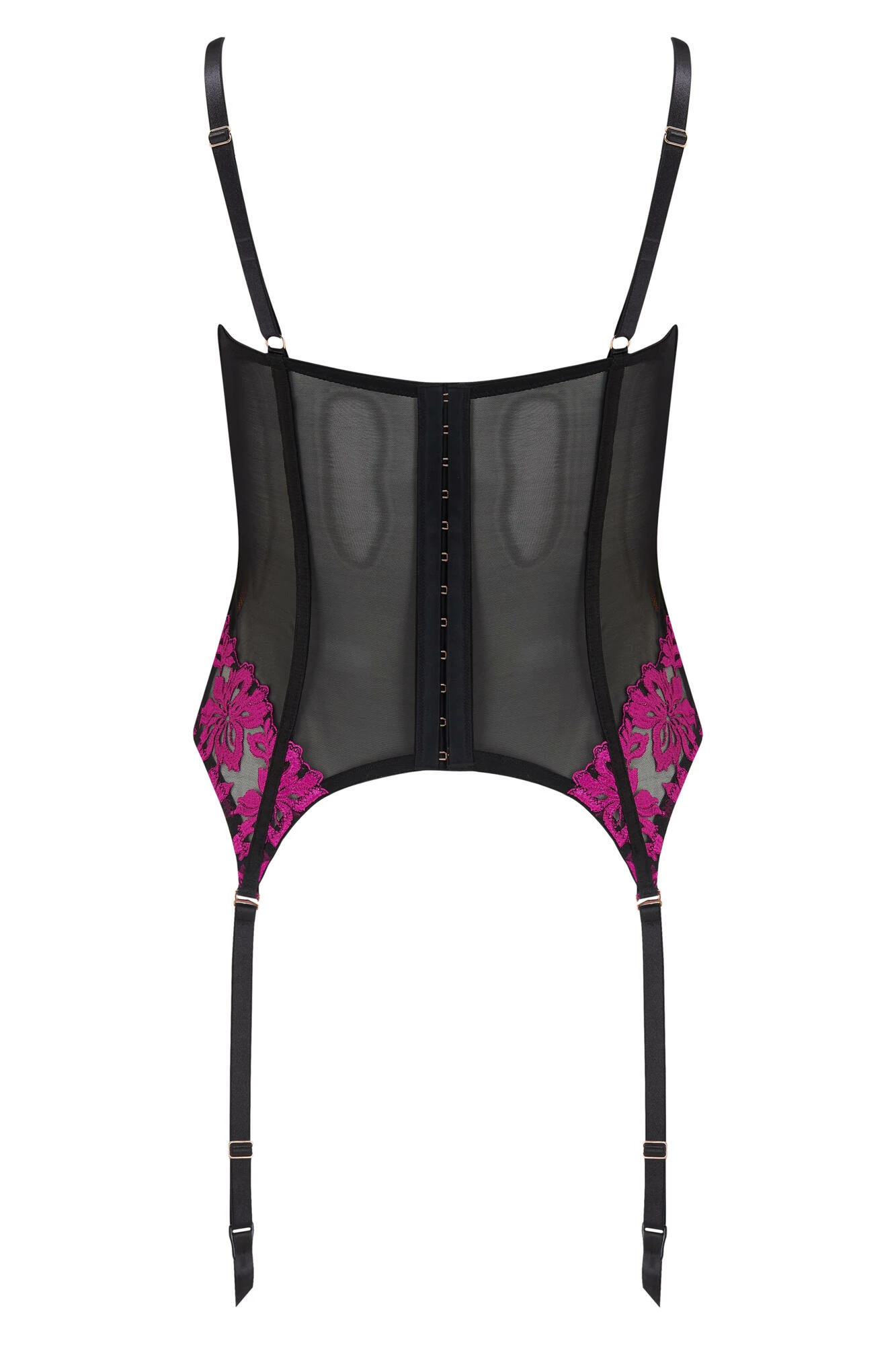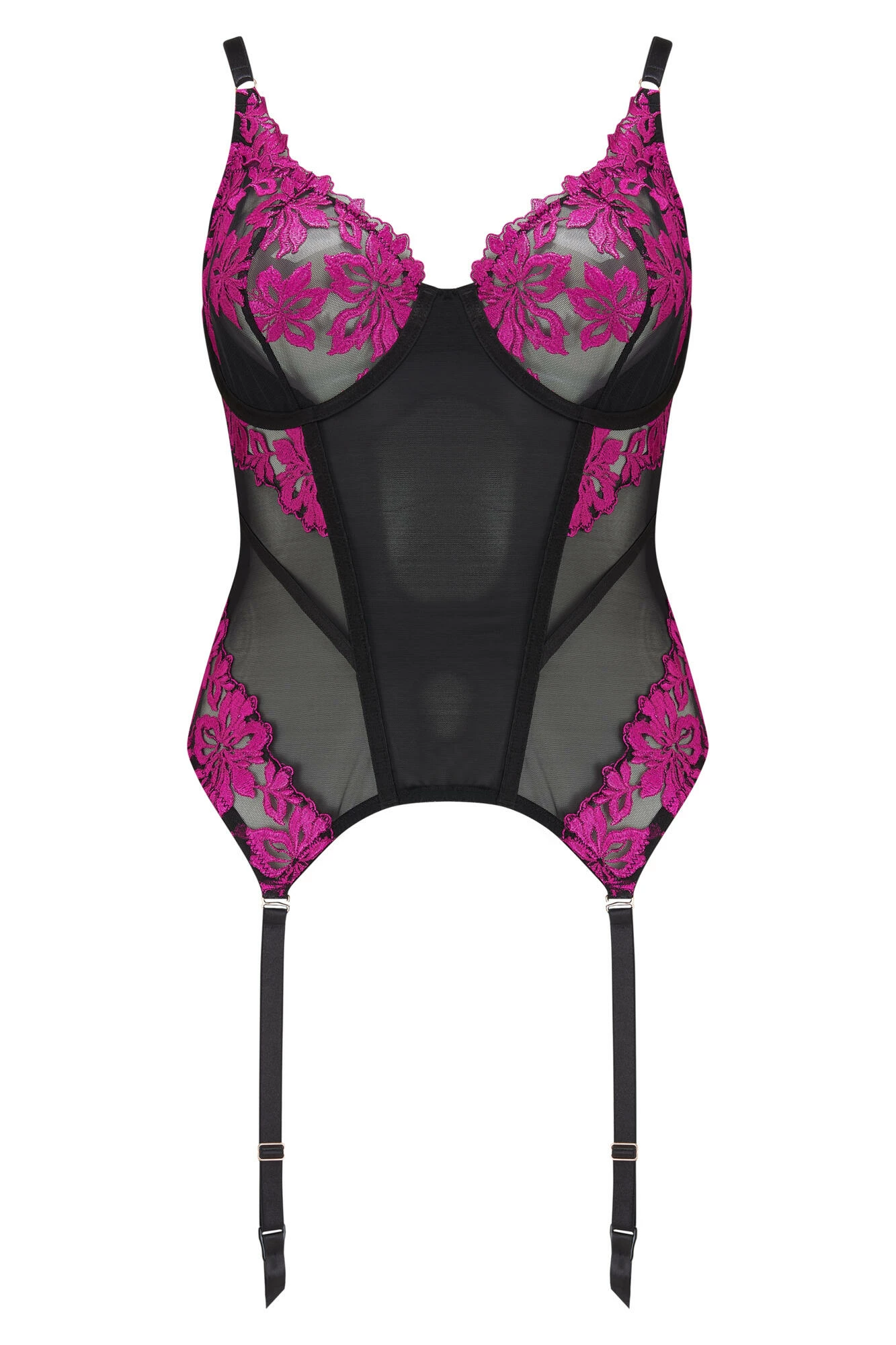 Turn down the lights and get ready to tantalise in this gorgeous basque. Contour your beautiful body with mesh panels to fit and flatter. The rose gold hardware details add a finishing touch of glam. Attach stockings and wear with matching lingerie from the Roxie Collection to unleash your inner temptress.